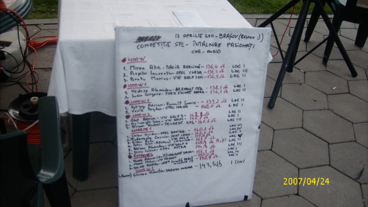 1.SZASZ ADRIAN-Peugeot 307SW 154.1db Amplificatoare 2xMNCS3000 si sub. 2x MNC ROCK 12 si 4 acumulatori.A fost o mini repetitie pt mine pt urmatoarele competitii.Am incercat sa determin cateva lucruri care se intampla in masina insa m-am bulversat si mai tare pt ca nu prea stiu ce s-a intamplat duminica . Sambata am dat repetat 154,3...154,4 chiar maximul 154,6 insa nu e problema sper ca in Ungaria cu "noul" sistem sa obtin plusul care imi doresc. |