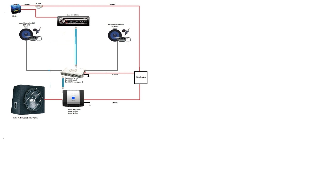 Cabluri: 0 AWG (50mm2); 4AWG (25mm2) siguranta 150 A