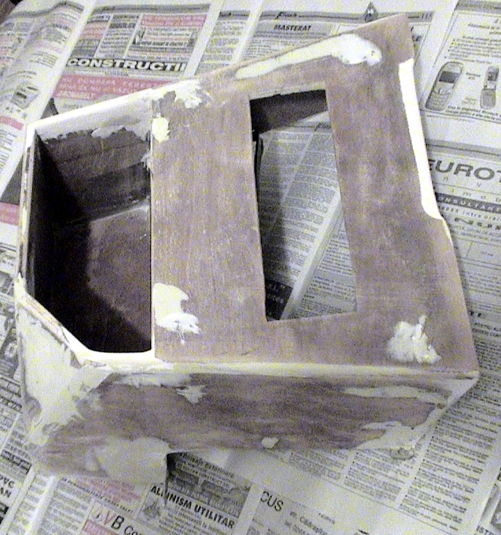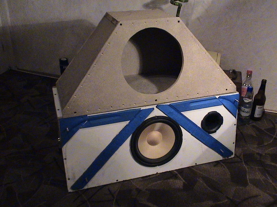Incinta pentru subwoofer (incinta pe compresie 36 litrii, in unele locuri cu perete dublu si cu ranforsari) In fotografii inca nu sunt puse ranforsarile, in interior este invelit cu burete.