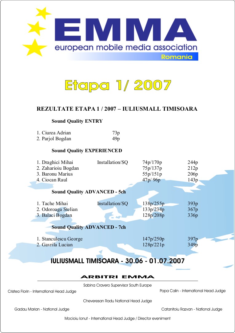 Nuu, masina lui Mihai nici nu a fost arbitrata de doamna Sabina Cravero, Arbitru international EMMA, si EMMA South East Europe Supervisor. Masinile de la SQ advanced au fost arbitrate de doamna Sabina + un arbitru international din Romania, iar masinile entry si experieced de un arbitru international + unul national. E interesant ce spui tu, ca cei trei romani, arbitri internationali, prezenti la Emma Timisoara nu sunt in potriviti pentru a arbitra, cu toate ca ei fac lucrul asta si la finala europeana! Oricum, am mai auzit treaba aia cu urechea formata