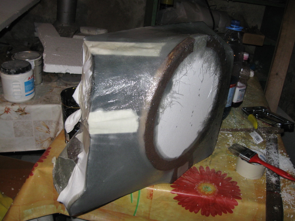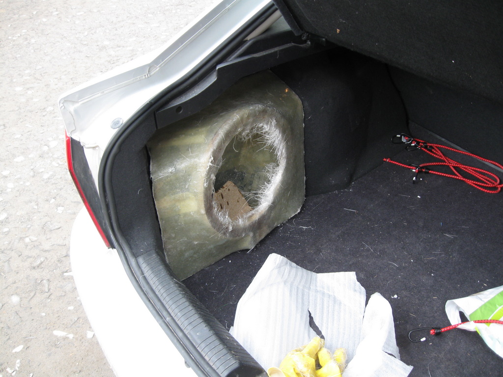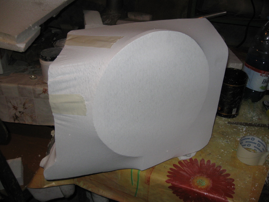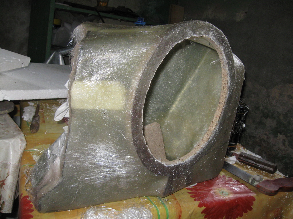 Pentru ca deja ai taiat-o (trebuia sa pui difuzorul acolo inainte sa tai, dar asta e), acum poti face o chestie gen ce am atasat eu mai jos. Sper sa intelegi: nu faci fata dreapta ci curbata in exterior. Cred ca iti poti face o idee.