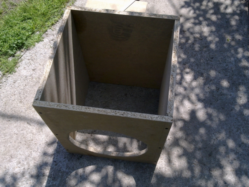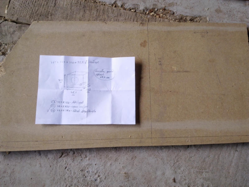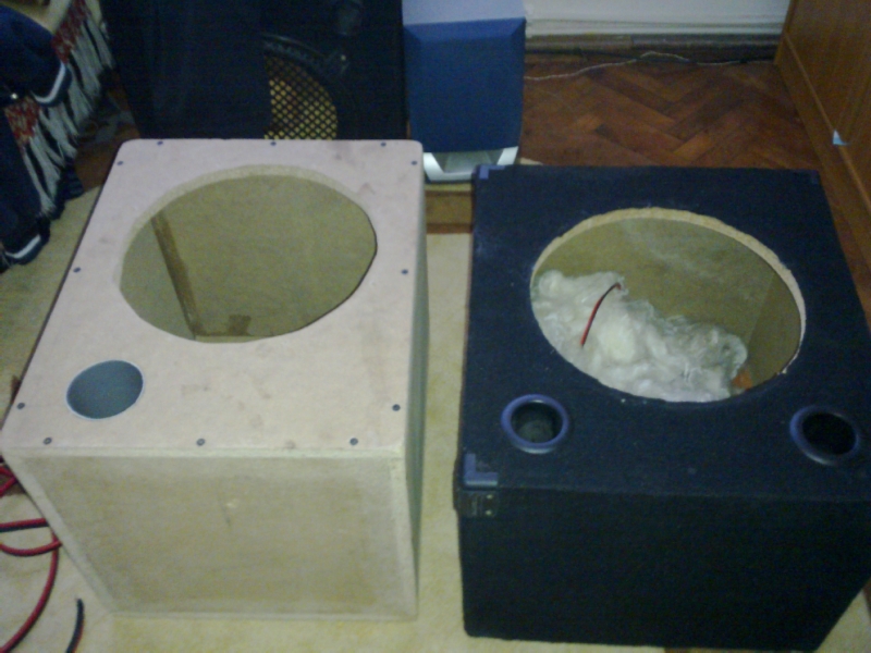 Incinta subwoofer-ului este doar pentru moment, in curand o sa construiesc una la dimensiunile precizate de producator 461x 373x 338 mm cu un port cilindric de 76mm diametru si 156 lungime.