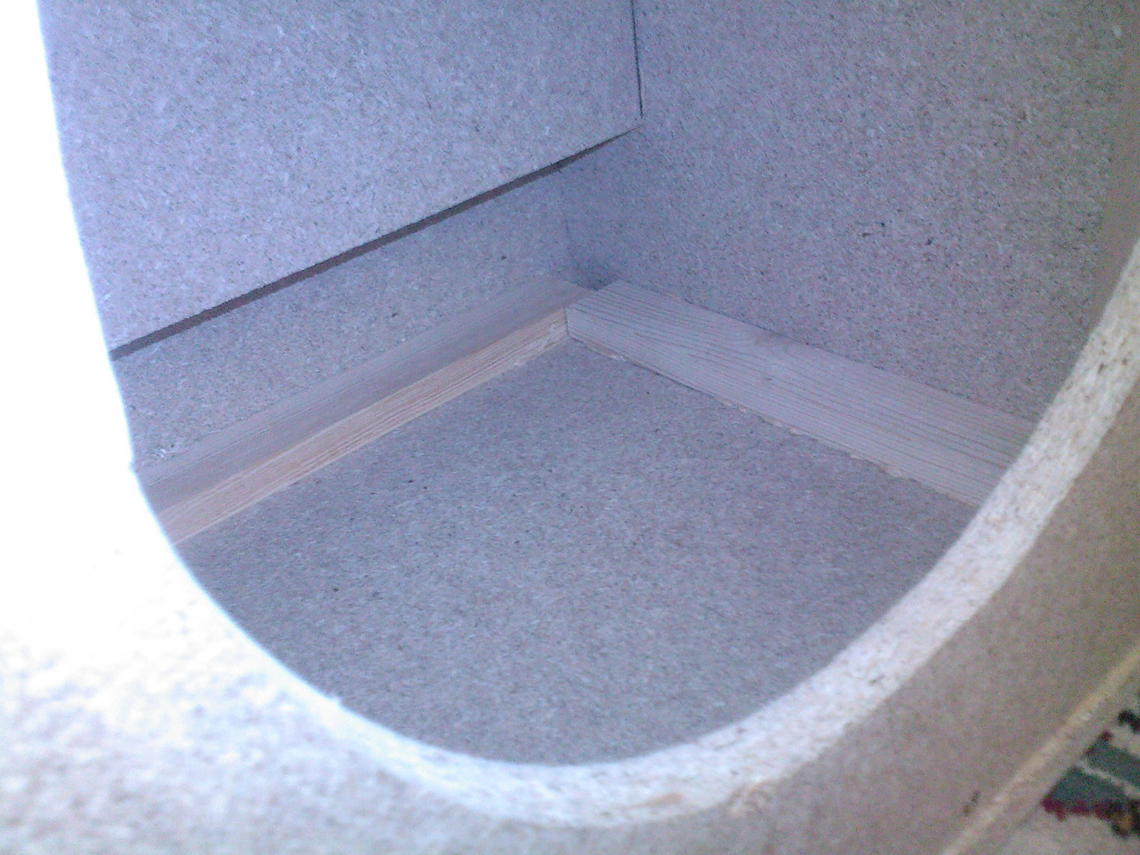 Incinta este din pal de 16mm, am folosit suruburi de lemn de 6 mm si adeziv Moment (sunt extreme de multumit de el, incinta a fost initial fara suruburi, pentru ca se usuca in 5 minute, si era deja incredibil de rezistenta). O sa observati ranforsari la fiecare colt (mai putin in port, pentru a nu afecta acordajul), de 2 x 4 cm. La calculul incintei au fost luate in calcul volumele ranforsarilor si cel al difuzorului.