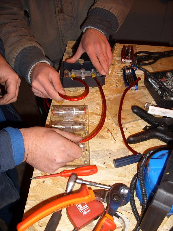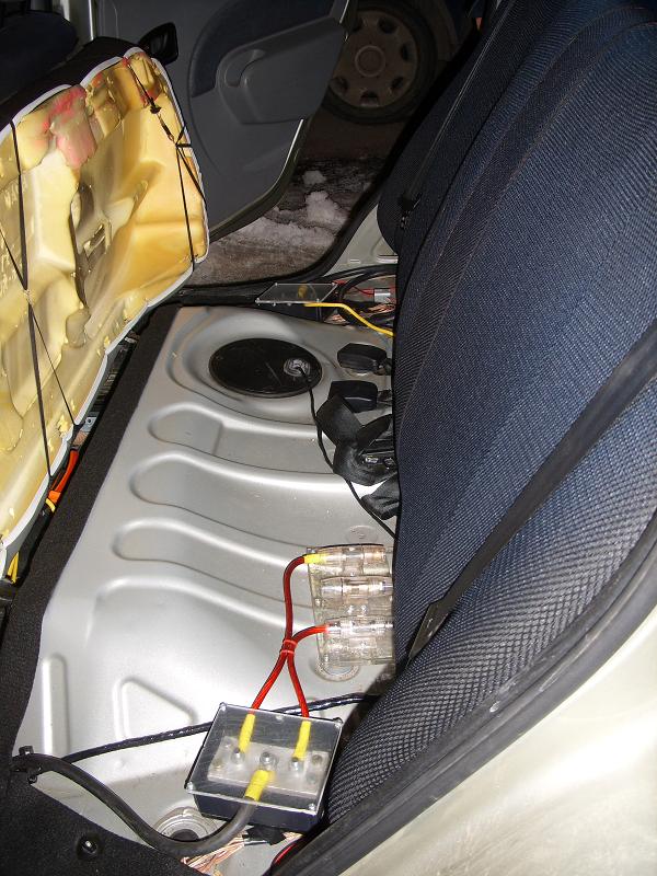 Intre timp cat s-a uscat rasina de pe stalpi, chitul...etc.. am lucrat si pe partea de alimentare care este compusa din: un traseu de 50mm^2 pana sub bancheta, distribuitor, si din distribuitor cablu corespunzator pentru fiecare amplificator. in poze se poate observa ca pe rack se afla 3 sigurante. a III-a siguranta este pusa pentru un al III-lea amplificator ce va veni in viitor, voi folosi amplificator separat pentru subwoofer si un altul pentru mid-basi.