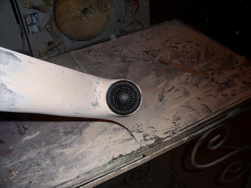 Pentru pozitionarea tweetere-lor m-am folosit de un tub de silicon taiat sub unghi si lipit pe stalp in pozitia finala peste care am turnat mai apoi fibra. Sa lasam pozele sa vorbeasca