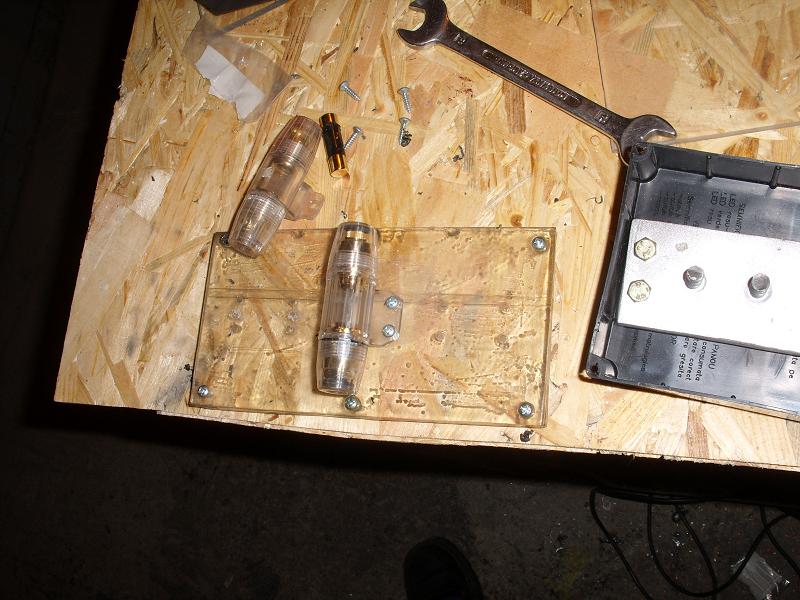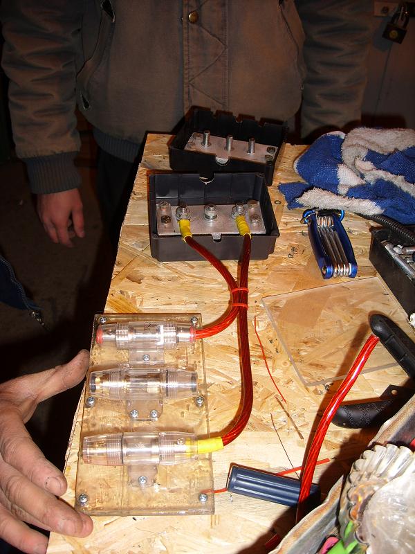 Intre timp cat s-a uscat rasina de pe stalpi, chitul...etc.. am lucrat si pe partea de alimentare care este compusa din: un traseu de 50mm^2 pana sub bancheta, distribuitor, si din distribuitor cablu corespunzator pentru fiecare amplificator. in poze se poate observa ca pe rack se afla 3 sigurante. a III-a siguranta este pusa pentru un al III-lea amplificator ce va veni in viitor, voi folosi amplificator separat pentru subwoofer si un altul pentru mid-basi.