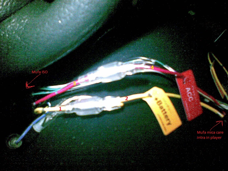 Cum ma asteptam, am scos playeru si ma uit ca un bou la cabluri si nu stiu care cum vine...am facut o poza la cablu ROSU si GALBEN din mufa ISO din Player. Pe cablu rosu scrie ACC si e legat la pinu 7, iar pe cablu galben scrie +BATTERY si e bagat la pinu 4. Intrebarea e: leg pur si simplu cablu galbn cu cel rosu prin acele mufe sau cum??? Am numerotat cablurile pe poza cu 1,2,3,4 si intrebarea e cum le leg: 1 cu 4 sau 3 cu 2!