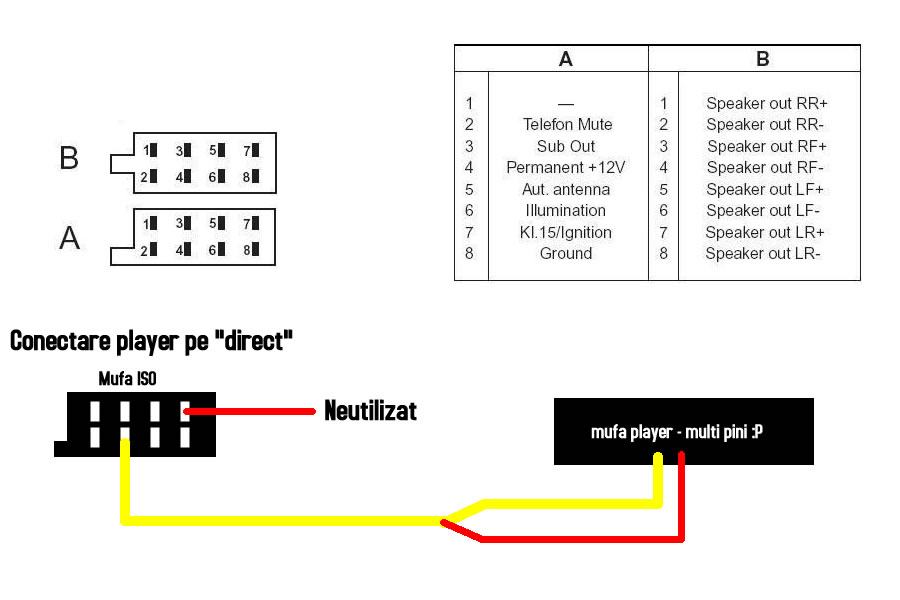 Ok, cum sunt incepator o sa intreb si eu probabil o prostie dar vreau sa fiu sigur. Am un Pio 2100UB si e totol ok, adica merge doar cu contactu pus( asa am vrut) DAR uita setarile, asa ca vreau sa il leg ca si in modalitatea 1, +Perm la pinul 4 si +Cont la pinul 7. Intrebarea e: leg acele 2 fire (rosu si galben) la pinul 4 si 7 din mufa ISO din MASINA sau cea din PLAYER ? eu cred ca cea din masina dar vreau sa fiu 100% sigur.
