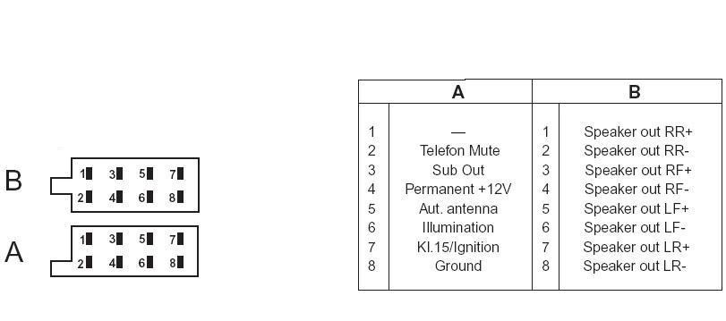 mufa B cred ca e clar pentru toata lumea cum sa o conecteze...4 canale +/-, 3/4 5/6 difuzoarele fata, 1/2 7/8 boxele spate, polaritate: pinii 1,3,5,7 + , pini 2,4,6,8 -.