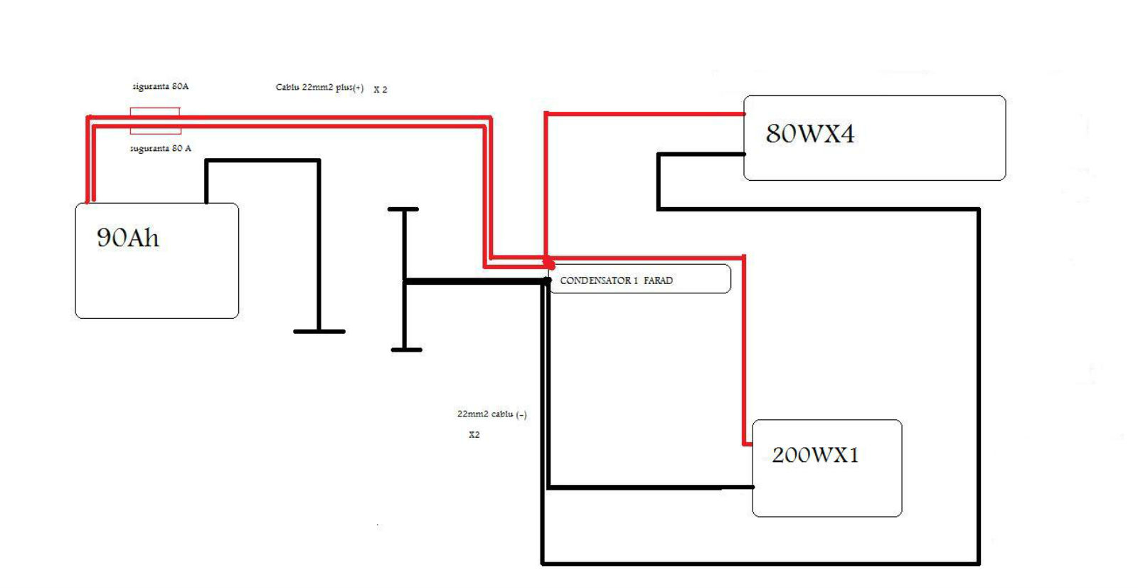 am baterie cum arata in poza 90Ah alternator 115Ah cu 2 fire (+)20mm2 si 2 fire (-) de la condensator la amplificatoare .........de la condensator am fir de 50 chiar mai gros se numeste my-f 50 cablu papuci suporta 80A care se vad in poza ...avand 2 amplificatoare va dati seama cate legaturi sunt pe condensator ......... in a 2 poza Voltaju motor oprit MULTUMESC MULT