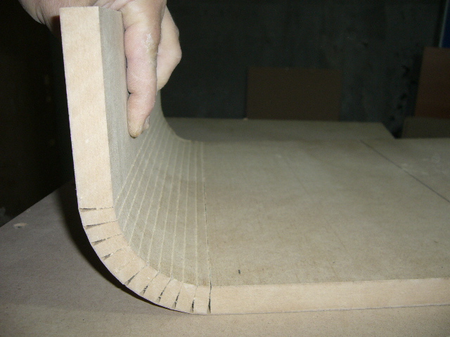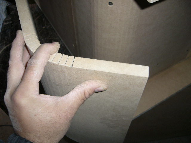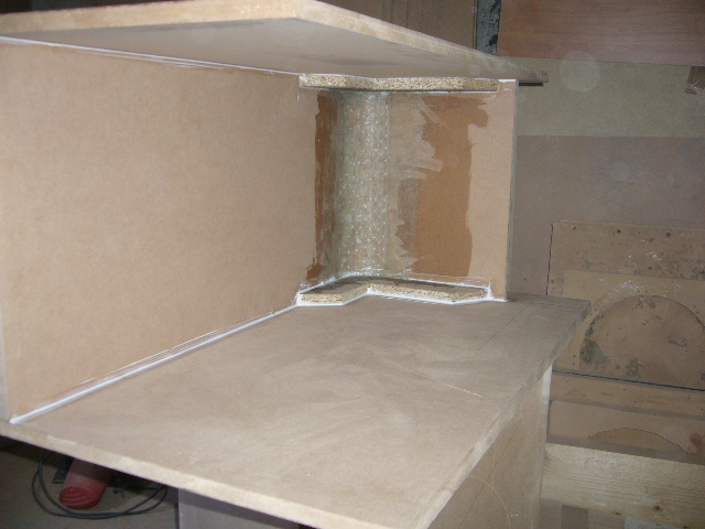 deci un bass reflex din mdf cu port flared (evazat0 interior - exterior care se face destul de usor si rapid , sunt mai multe metode de evazare a lemnului , prin crestare si aducere la unghiul dorit ,prin laminare mdf si jlefuire cu banda pana la evazajul dorit sau prin laminarea mai multor placaje subtiri cu incleier intermediara . ieu am ales cea mai rapida metoda si de multe ori cea mai fiabila . deci sa luat o placa de mdf 18mm sa crestat de 12 ori , sa adus la unghiul dorit sa asigurat cu 2 coltare din pal ,dupa care se da multe gauri in toate santurile executate inainte , acestea se vor umple cu seringa cu aracet pana la refuz , dupa care se ia o bucata de stratimat pe dimensiunile dorite si se incleiaza cu ajutorul rasini . dupa uscare se executa restul incintei care este patea mai usoara , la interior portul a fost evazat prin stratificare si jlefuire . momentan proprietarul nu are 1200 - 1500 w sal miste cum trebuie dar se rezolva .