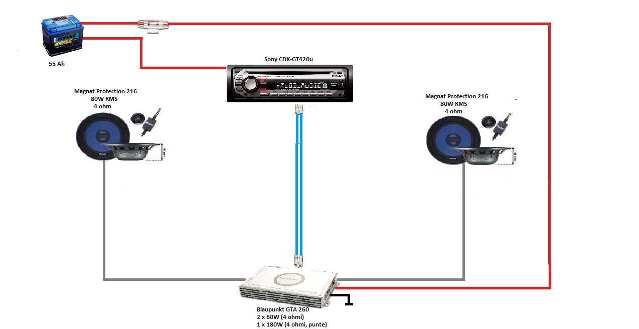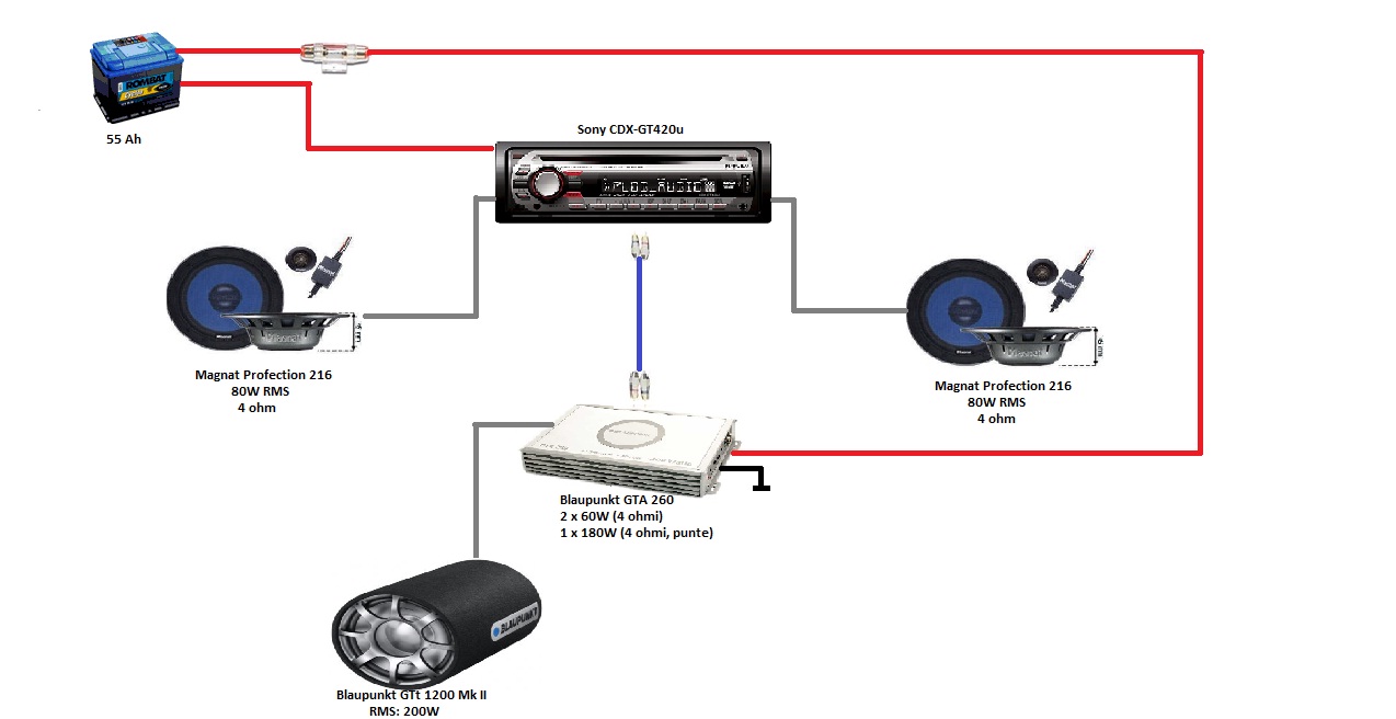 Salut, m-am hotarat sa imi schimb sculele audio si vreau sa va cer un sfat ca sa nu fac ca sa nu fac alegeri gresite si a 2-a oara.Am facut o schema a sistemului pe care il am momentan in masina ca sa ne intelegem mai usor (sper sa fie corecta...e insipirata din alta schema de pe forum ).Si acum sa va spun ce planuri am eu...vand subwooferul blaupunkt iar statia o pastrez ca sa amplific difuzoarele din fata ( Magnat PF 216), apoi vreau sa mai achizitionez o statie si un subwoofer.Ca sa fac lucrul asta am inteles ca am nevoie de cabluri rca in y pentru ca HU-ul meu nu are decat 2 iesiri RCA, cabluri dedicate banuiesc...cele actuale nu sunt dedicate car audio.Ca subwoofer m-am gandit sa cumpar un "Pioneer TS-W308D4/ Pioneer TS-W308D2"(daca stiti ceva mai bun va rog sa spuneti) Nu stiu care sa il cumpar, iar la Amplicifator inca nu m-am gandit dar vreau ceva mai ieftin, chiar la mana a 2-a daca imi puteti recomanda ceva.Va rog sa imi spune-ti daca este ceva in neregula cu ceea ce am eu de gand sa fac ca sa nu am vreo surpriza.