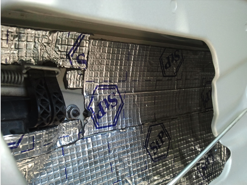 A urmat exteriorul fetei de usa. Am pus prima folie, am incercat sa pun bucati cat mai mari...Chiar a iesit ok. Cand am incercat sa pun fata de usa la loc sa vad cum pica SOC . !! > Asa cum se vede , in pozele 18 si 19 am uitat sa mai verific daca fata de usa mai se potriveste peste tabla. Are o adancitura spre interior si un ``fagure`` sa-i zic asa care nu imi permite sa montez fata de usa pe tabla cu insonorizant. Sunt in impas. Ce asa putea sa fac , ce ma sfatutiti?