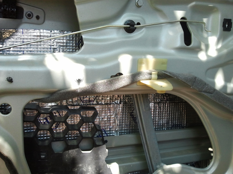 Singura solutie pe care o vad eu ar fi sa mulez insonorizantul intr-un fel dupa forma rotunda a buzunarului in interiorul usii. Dar cum? Usor de spus , dar greu de facut pt. cineva care nu a mai facut asta niciodata.