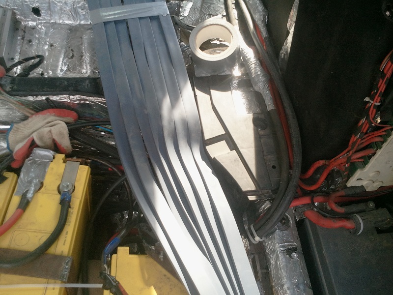 este bara de cupru , 7 trasee . Din fata vin doar 3 cabluri de 0 awg pentru un alternator de 250 amperi... restul va fi totul pe bara de cupru. Oricum multe cabluri din ce vezi in poza vor disparea... abia s-a inceput munca la conectica.