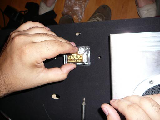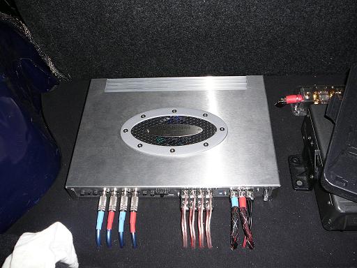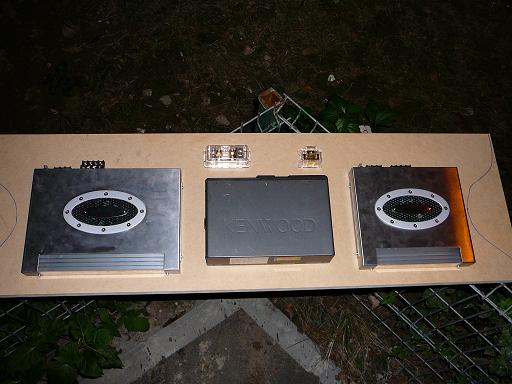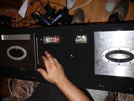 In spate s-a confectionat o placa de MDF pe care s-au prins cele 2 amplificatoare, magazia de CD-uri, blocurile distribuitoare pentru + respectiv -.