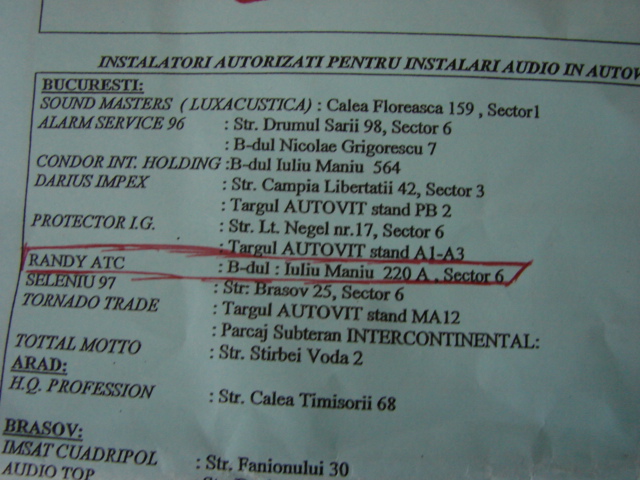 da domnule...alta treaba...am fost pt montarea unui amplificator la TORNADO TRADE...pai inafara faptului ca pe langa manopera am mai dat 150 de lei pt alte cabluri adaptoare etc (nu comentez pretul final ...a fost corect) se vede difeenta de alte "service-uri audio"!!! se lucreaza frumos ..lume prietenoasa...etc!!! BRAVO lor...asta este parerea mea dspre tornado trade ->parcare intercontinental
