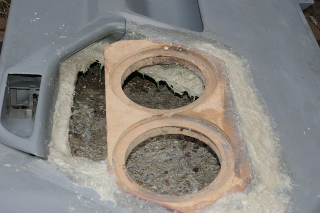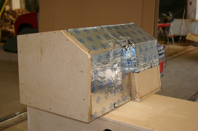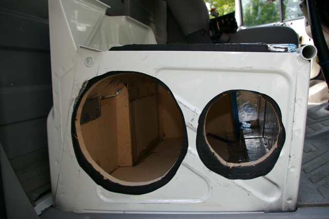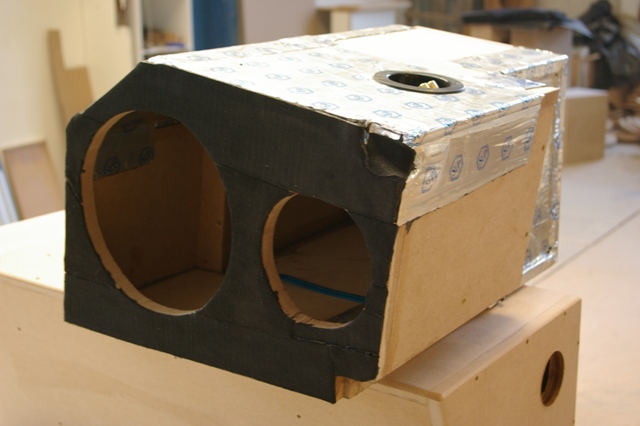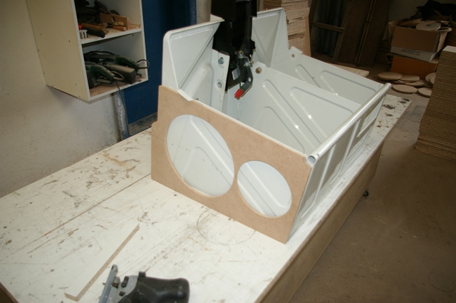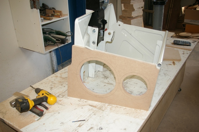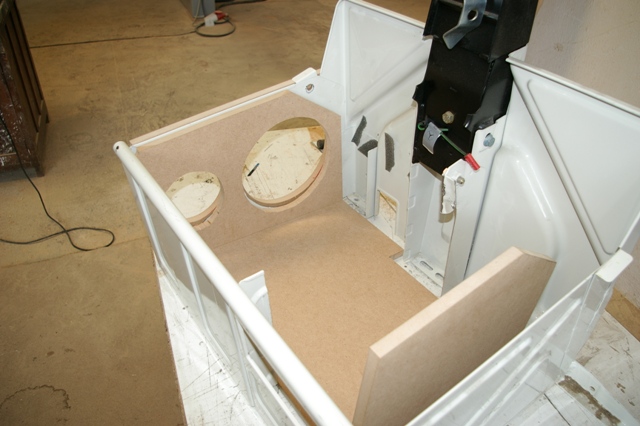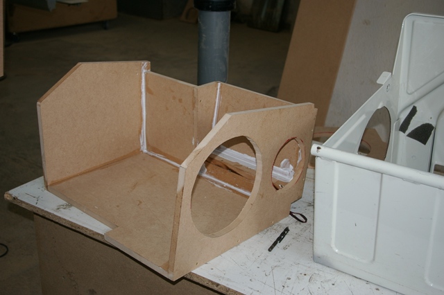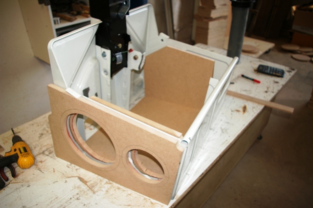 Partea din fata, sa ii spunem asa, a suportului de tabla al banchetei a fost facut sandwish intre doua placi de MDF. Si iata ca a aparut fata incintei!