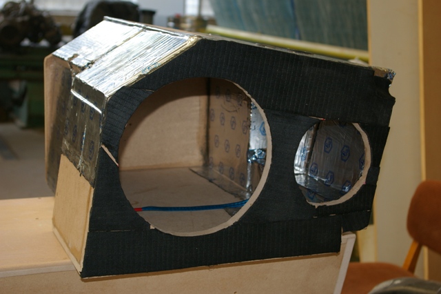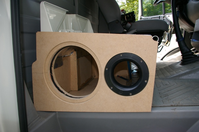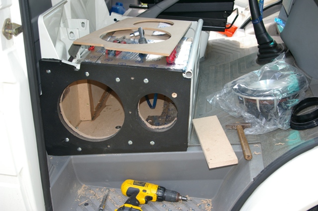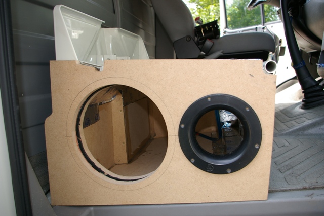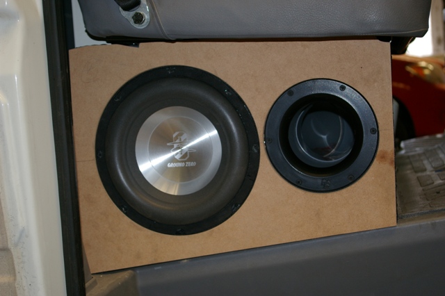 Exact. Urmeaza construirea incintei pentru subwoofer. Un traductor de 10 inch, 25 de cm a fost singura alegere. Una si buna! Pozitionarea in cabina, in partea opusa "ascultatorului". Radiatia indirecta ajuta extraordinar la creerea unui sunet extraordinar in domeniul de frecvente sub-joase.