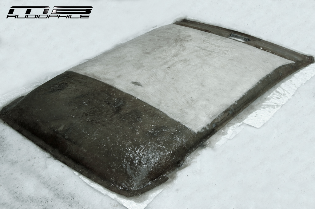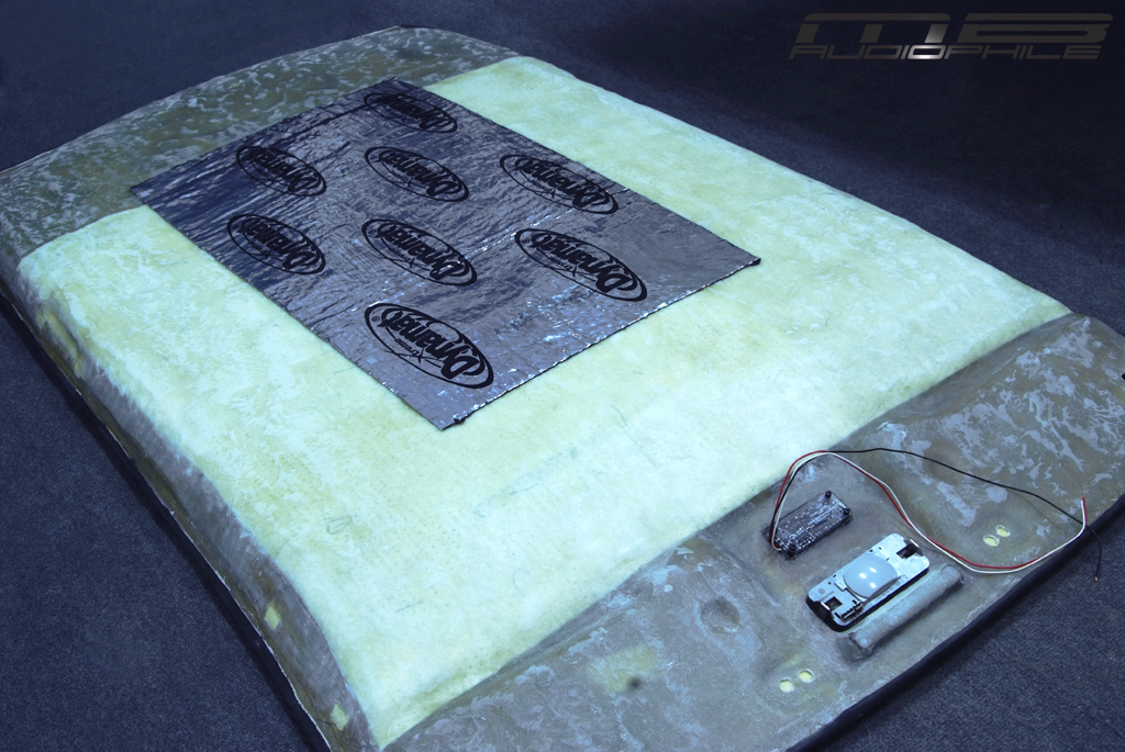 Apoi s-a intarit ce a mai ramas din plafon cu fibra de sticla, rasina si coremat urmand apoi a fi imbracata partea din spate cu Dynamat Extreme.