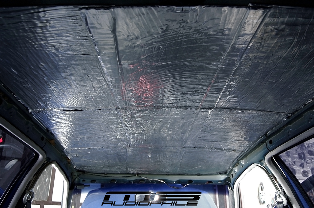 Pe plafonul masinii s-a folosit Second SKin Damplifier Pro. Plafonul a fost imbracat ulterior in Alcantara si s-a incorporat in el un Voltmetru Brax.
